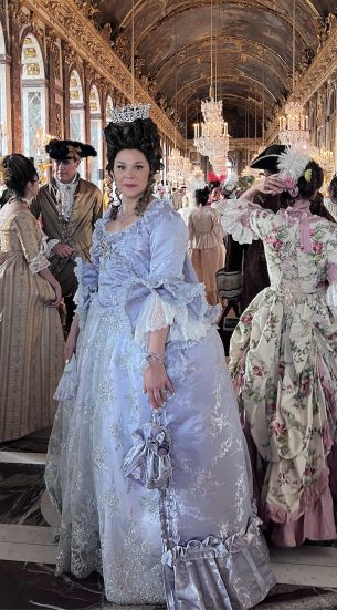 This was a custom commissioned for the 2025 Fete Galantes held in the Palace of Versailles. The commission included, the Robe a la francaise, stomacher with hidden center zipper, decorative petticoat with an embroidered overlay,…