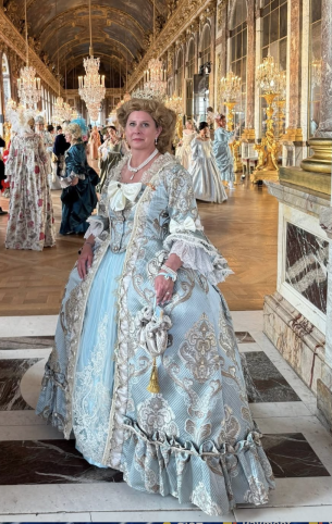 This is a custom 18th century style gown that was commissioned to be worn at the 2025 Fete Galantes de Versailles gala, held in the Palace of Versailles. The gown features a saque back and…