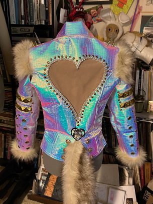 This jacket is constructed in a crocodile patterned embossed iridescent upholstery fabric. The sleeves are heavily detailed with studs, spikes, rhinestones and grommets, finished with a faux fox fur strip at wrist and shoulder. The back has a heart-shaped…